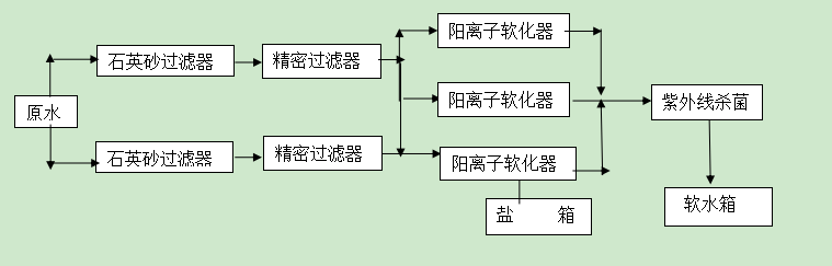 當含有硬度離子的原水通過交換罐體內(nèi)納型樹脂時,水中鈣離子、鎂離子被樹脂中的鈉離子交換吸附,去掉鈣離子、鎂離子除去碳酸鹽或非碳酸鹽硬度,即為軟化水。
